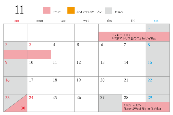 10月30日(木)~11月3日(月・祝)11:00〜18:00 火曜定休